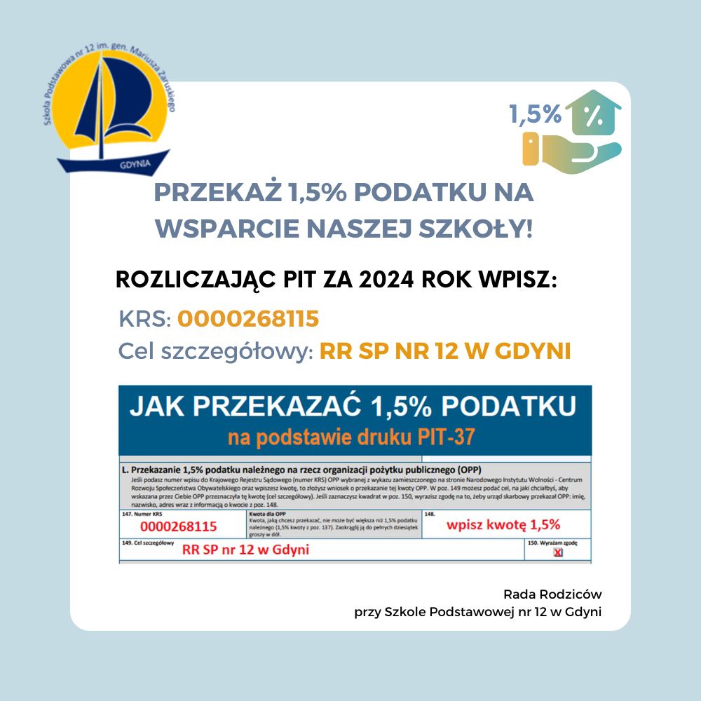 Nie zapomnij! Rozliczając PIT za 2024 rok, wesprzyj SP 12 w Gdyni. To nic nie kosztuje.