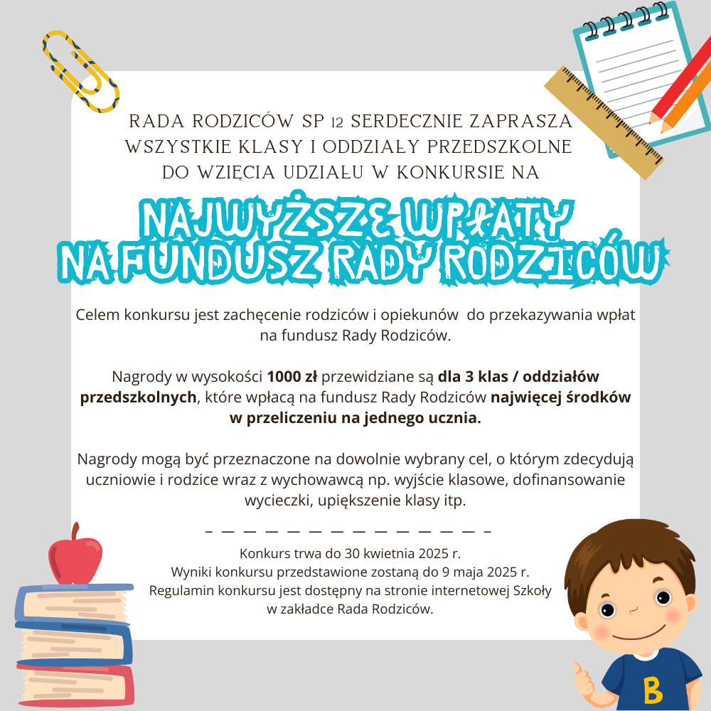 Rada Rodziców ogłasza konkurs dla oddziałów przedszkolnych i klas 1-8 na Najwyższe wpłaty na fundusz Rady Rodziców.
